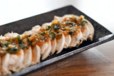 ⑥鶏肉を取り出して水分をふき、皮は2~3mm幅の細切り、身は2~3mm厚さに切り、器に盛って、④とラー油をかけてパクチーをのせれば出来上がり
