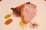 ②豚肉の片面に塩、黒こしょうをふり、脂身が交互になるように3枚重ね、形を整える