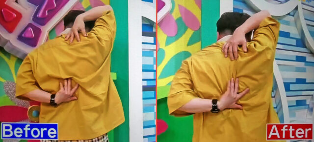 肩こりを改善する筋膜ストレッチを実践した和牛水田さん、日テレの滝菜月アナは2人とも肩の可動域がかなり広がっていましたよ。