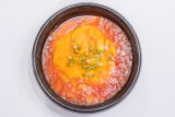 ⑩トマトライスを切るように混ぜ、カップでドーム型にして皿に盛る。トマトカレールーをかけ、トマトカツをのせれば出来上がり